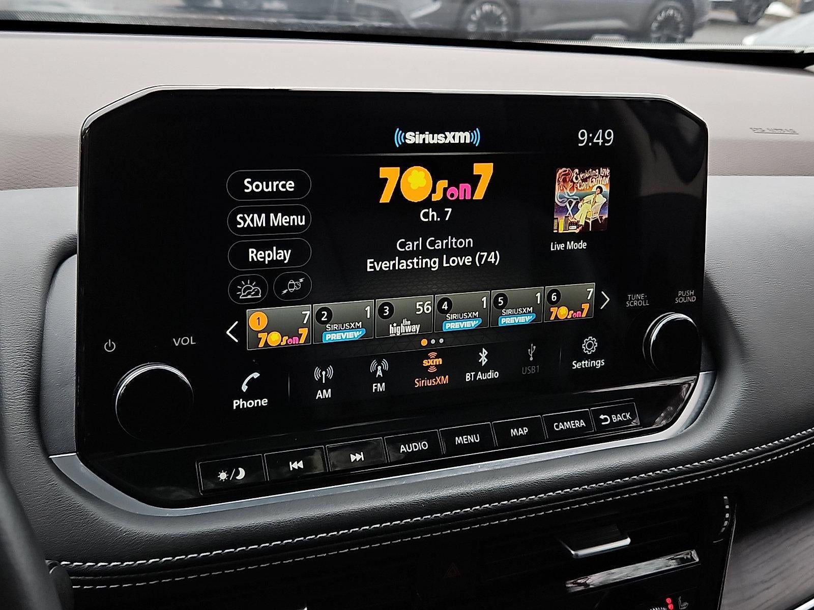 - Radio: AM/FM NissanConnect w/Navigation -inc: Nissan door to door navigation w/3D building graphics and satellite imagery featuring online POI search and online premium traffic information, SiriusXM Traffic, SiriusXM Travel Link, 9" color display w/multi-touch control, NissanConnect featuring Apple CarPlay and Android Auto, SiriusXM Satellite Radio, 2 illuminated USB connection ports (1 type-A, 1 type-C), Bluetooth® hands-free phone system, streaming audio via Bluetooth® and hands-free text messaging assistant